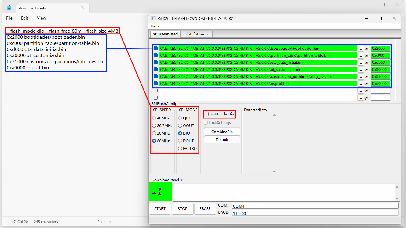 PORTNAME和download.config参数;esptool.py --chip auto --port PORTNAME --baud 115200 --before default_reset --after hard_reset write_flash -z download.config