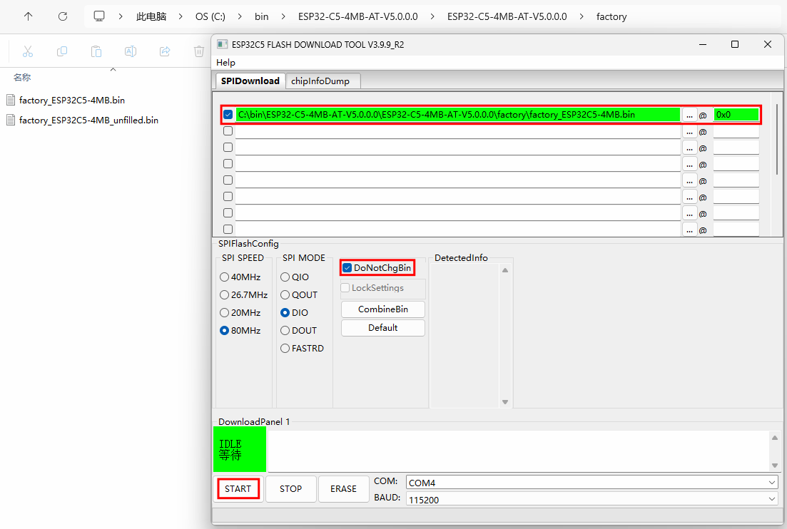 FILEDIRECTORY替换成打包好的量产固件的文件路径,通常情况下,文件路径是factory/XXX.bin。以下是将固件烧录至 ESP32-C5-WROOM-1 模组输入的命令:
