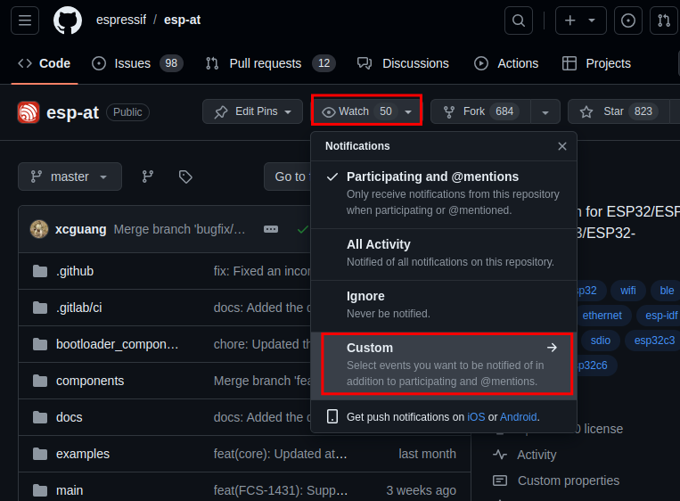 访问 ESP-AT 仓库,点击页面右上角的 Watch,再点击 Custom。