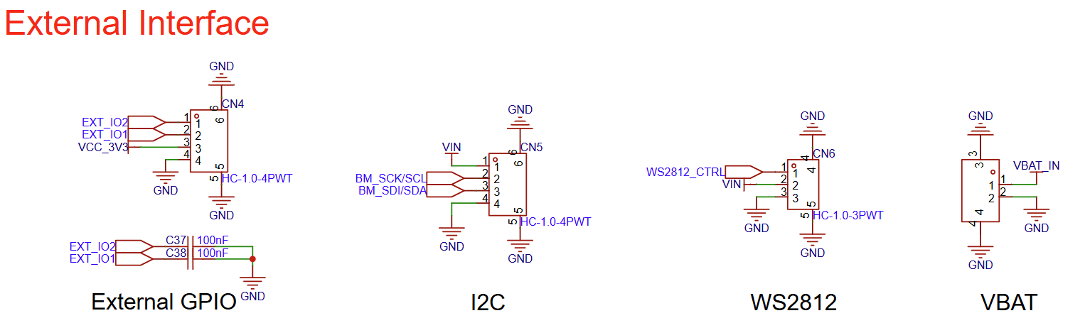 Battery connector that can connect to an external 3.7V lithium battery, using HC-1.25-2P wire-to-board connector. |