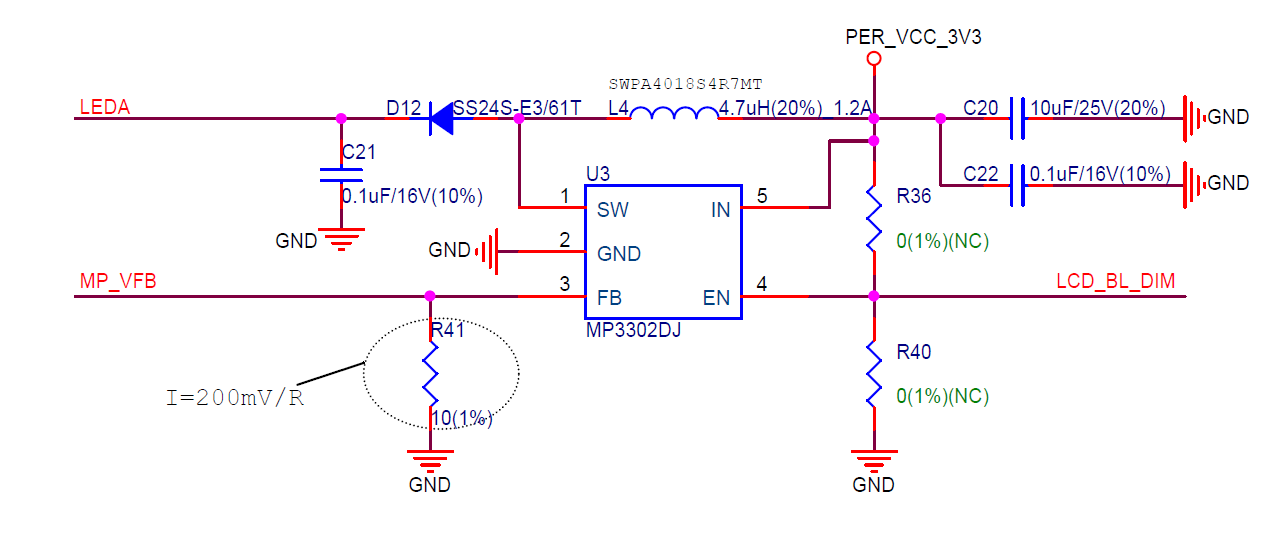 由于 PWM 调光可能会带来闪烁,且部分 Booster IC 不支持高频 PWM 信号控制,该开发板提供了 DC 调光电路以解决上述问题,如下图所示: