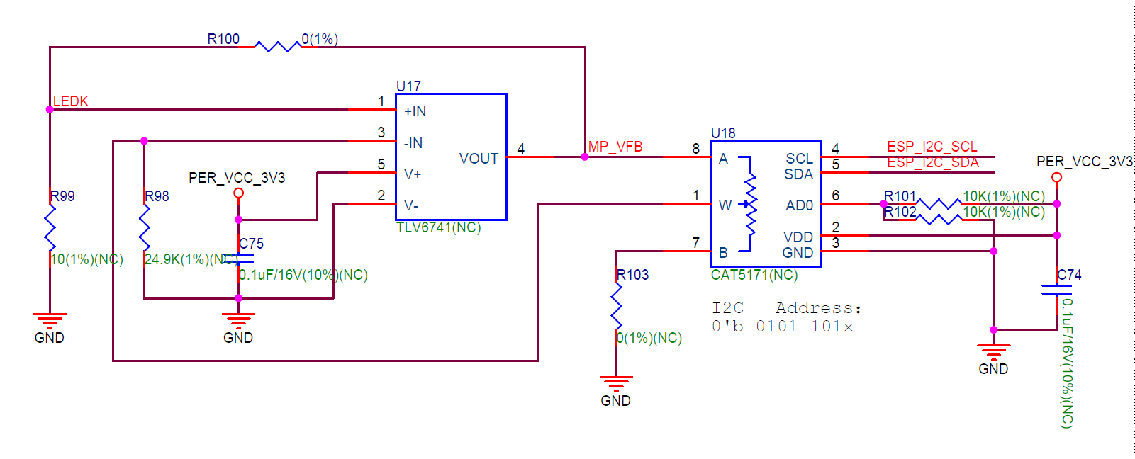 该 DC 调光电路将 VFB 电压输入到运算放大器 TLV6741,其增益电阻为数字电位器,可以通过 I2C 总线修改其阻值以达到修改增益大小的目的。使用的数字电位器为 CAT5171,具有 256 级分辨率,最大电阻值为 50 kOhm。