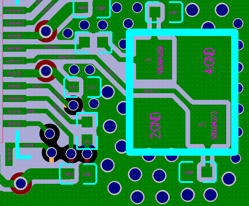 There should be no high-frequency signal traces routed close to the RF trace. The RF antenna should be placed away from high-frequency components, such as crystals, DDR SDRAM, high-frequency clocks, etc. In addition, the USB port, USB-to-serial chip, UART signal lines (including traces, vias, test points, header pins, etc.) must be as far away from the antenna as possible. The UART signal line should be surrounded by ground copper and ground vias.