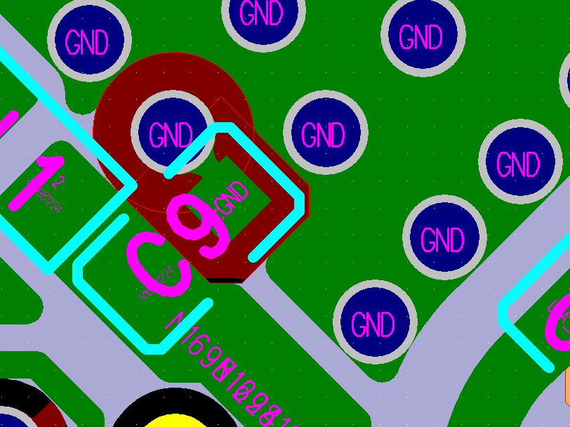 Add a stub on the grounding capacitor near the chip side in the CLC matching circuit to suppress the second harmonics. It is preferable to keep the stub length 15 mil, and determine the stub width according to the PCB stack-up so that the characteristic impedance of the stub is 100 Ω ± 10%. In addition, please connect the stub via to the third layer, and maintain a keep-out area on the first and second layers. The trace highlighted in figure below is the stub. Note that a stub is not required for package types of 0402 and above.