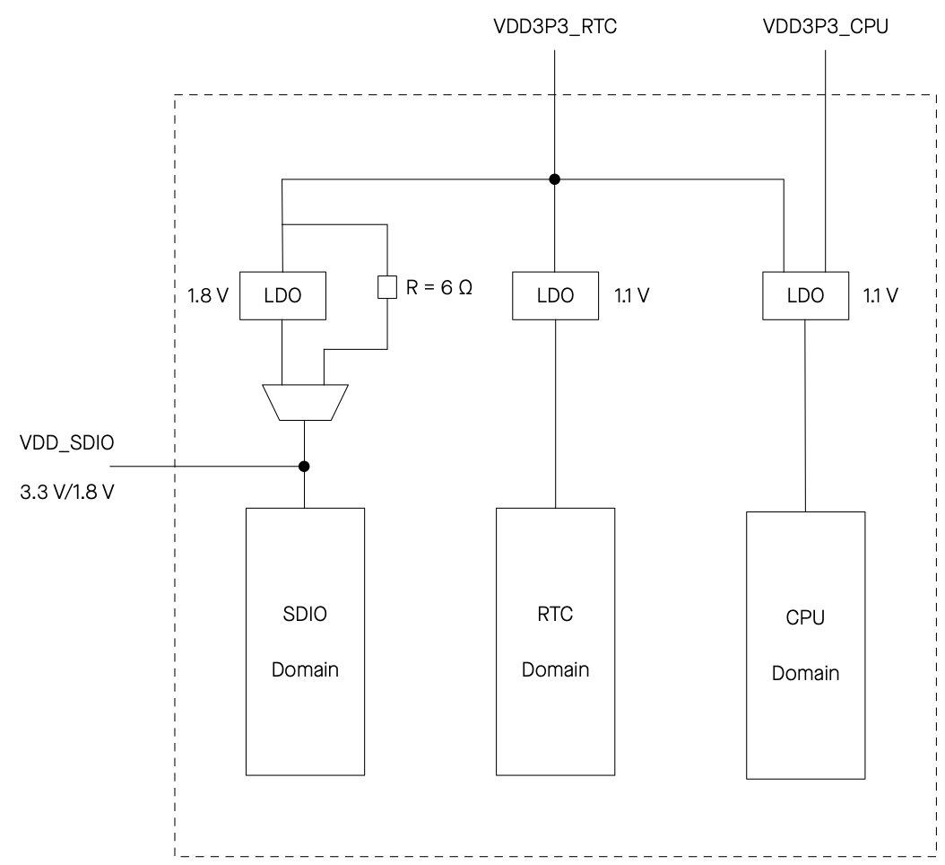 VDD_SDIO 也可以连接到外部电源,由外部电源输入供电。