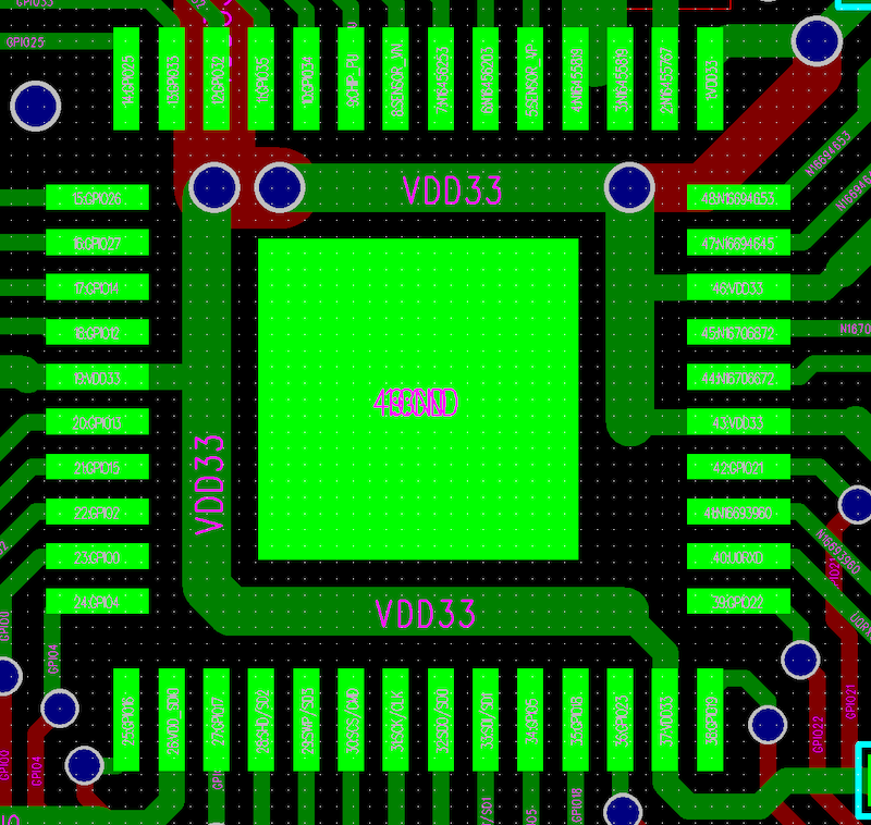 上图中属性为 VDD33 的走线即为 3.3 V 电源走线。与四层板设计不同的是,电源走线需尽可能走在顶层。故需要将芯片中间的散热焊盘缩小,电源走在四周信号管脚与散热焊盘之间,只在不得不换层的位置,打孔至底层穿一段走线。