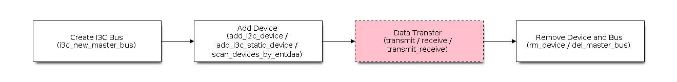 This section will quickly guide you through using the I3C master driver. It demonstrates how to create a bus, add devices, and perform data transfers. The general usage flow is as follows: