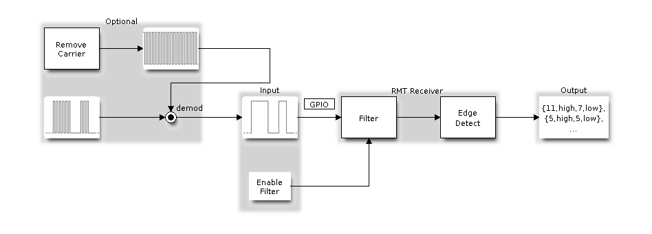 The RMT receiver can sample incoming signals into RMT data format, and store the data in memory. It is also possible to tell the receiver the basic characteristics of the incoming signal, so that the signal's stop condition can be recognized, and signal glitches and noise can be filtered out. The RMT peripheral also supports demodulating the high-frequency carrier from the base signal.