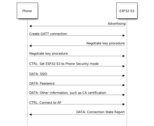 After the GATT connection is successfully established, the mobile phone will send a data frame for key negotiation to ESP32-S3 (see the section The Frame Formats Defined in BluFi for details).
