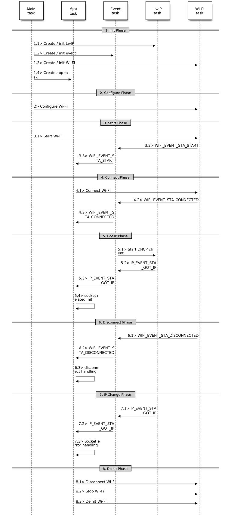 In above scenarios, ideally, the application sockets and the network layer should not be affected, since the Wi-Fi connection only fails temporarily and recovers very quickly. The application can enable “Keep TCP connections when IP changed” via LwIP menuconfig.