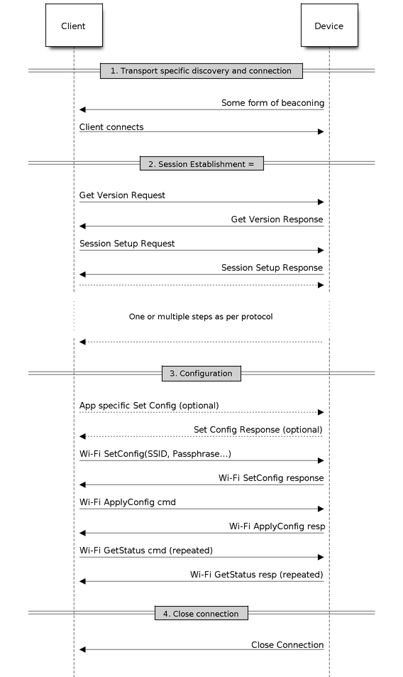 Transport Flexibility: The protocol can work on Wi-Fi (SoftAP + HTTP server) or on BLE as a transport protocol. The framework provides an ability to add support for any other transport easily as long as command-response behaviour can be supported on the transport.