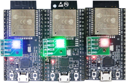 We are going to demonstrate process of setting and operation of a small ESP-BLE-MESH network of three nodes. This process will cover device provisioning and node configuration, and then sending on/off commands to Generic OnOff Server Models on specific nodes.