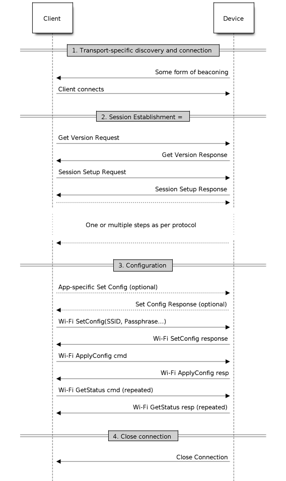 The protocol can work on Wi-Fi (SoftAP + HTTP server) or on Bluetooth LE as a transport protocol. The framework provides an ability to add support for any other transport easily as long as command-response behavior can be supported on the transport.