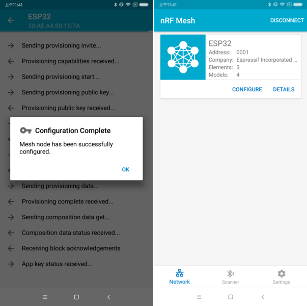 Then, the App will try to provision the unprovisioned device. When the device is provisioned successfully, the RGB LED on the board will turn off, and the App will implement the following procedures:
