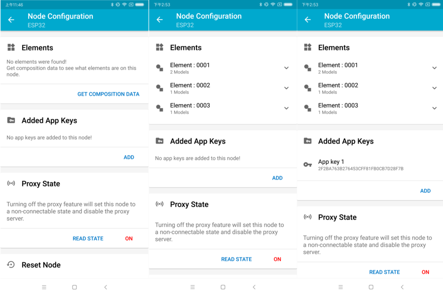 The right picture shows that after connecting with any node successfully, the App displays the information of the three nodes. Users can see that the App has got the Composition Data of the first and the second nodes, but for the third one, only the unicast address has been assigned to it while the Composition Data is unknown.