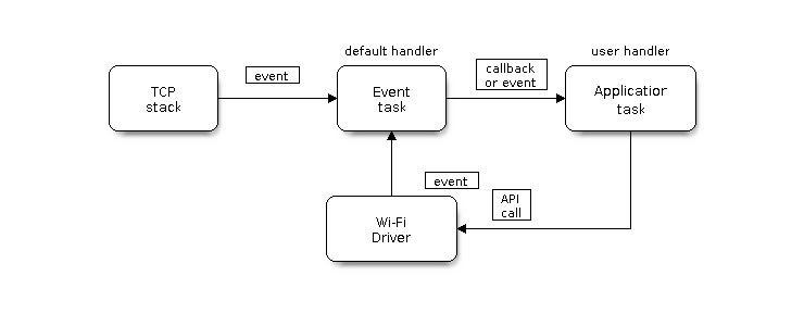 The Wi-Fi driver can be considered a black box that knows nothing about high-layer code, such as the TCP/IP stack, application task, and event task. The application task (code) generally calls Wi-Fi driver APIs to initialize Wi-Fi and handles Wi-Fi events when necessary. Wi-Fi driver receives API calls, handles them, and posts events to the application.