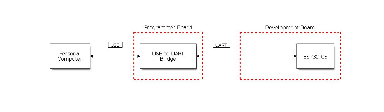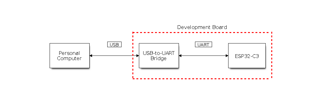 For boards with an installed USB-to-UART bridge, the connection between the personal computer and the bridge is USB and between the bridge and ESP32-C3 is UART.