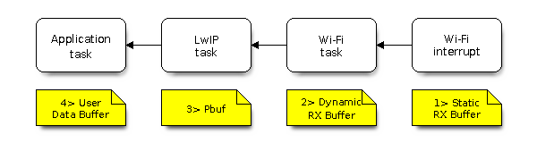 The Wi-Fi driver allocates a "Dynamic Rx Buffer", makes a copy of the "Static Rx Buffer", and returns the "Static Rx Buffer" to hardware.