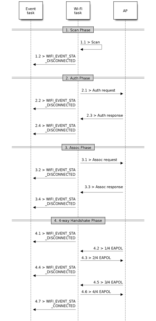 In step 4.2, the Wi-Fi connection may fail because, for example, the password is wrong, or the AP is not found. In a case like this, WIFI_EVENT_STA_DISCONNECTED will arise and the reason for such a failure will be provided. For handling events that disrupt Wi-Fi connection, please refer to phase 6.