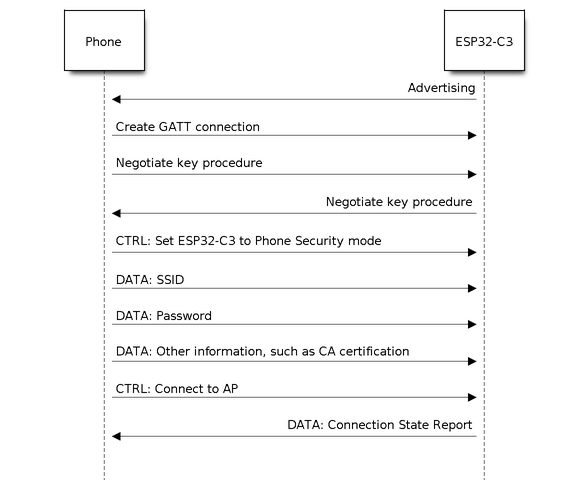 After the GATT connection is successfully established, the mobile phone will send a data frame for key negotiation to ESP32-C3 (see the section The Frame Formats Defined in BluFi for details).