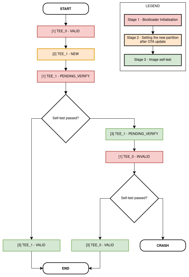The new TEE application starts executing, but it needs a self-test to confirm its operability. As we reach the point of entry of the non-secure app, we consider the rollback self-test to be successful. The application is then marked as valid (state VALID) and selected across further reboots if there are no updates to the device.
