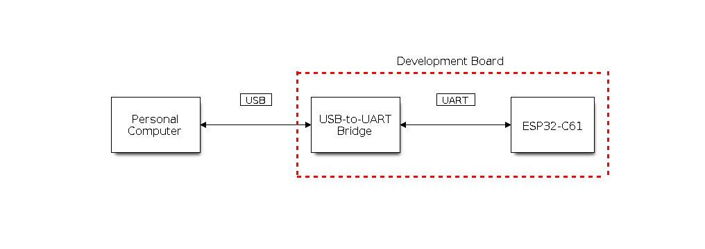 For boards with an installed USB-to-UART bridge, the connection between the personal computer and the bridge is USB and between the bridge and ESP32-C61 is UART.