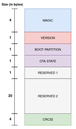 The TEE OTA data partition is two flash sectors (0x2000 bytes) in size, to prevent problems if there is a power failure while it is being written. Sectors are independently erased and written with matching data, and if they disagree a counter field is used to determine which sector was written more recently.