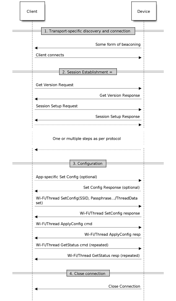 The protocol can work on Wi-Fi (SoftAP + HTTP server) or on Bluetooth LE as a transport protocol. The framework provides an ability to add support for any other transport easily as long as command-response behavior can be supported on the transport.