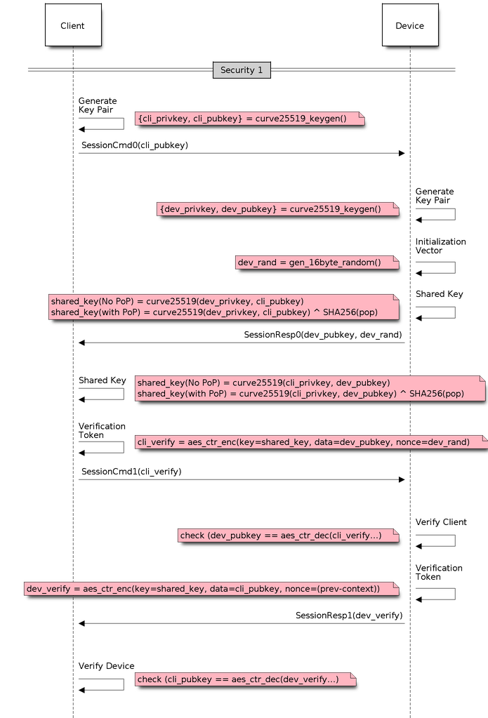The respective security schemes need to be enabled through the project configuration menu. Please refer to Enabling Protocomm Security Version for more details.