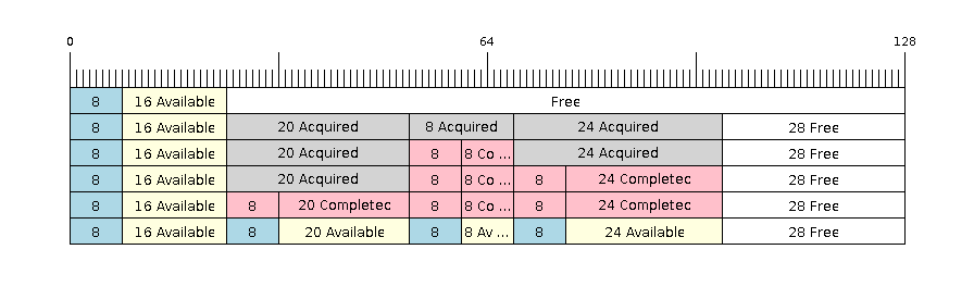 The following diagrams illustrate the differences between No-Split and Allow-Split buffers as compared to byte buffers with regard to sending items or data. The diagrams assume that three items of sizes 18, 3, and 27 bytes are sent respectively to a buffer of 128 bytes:
