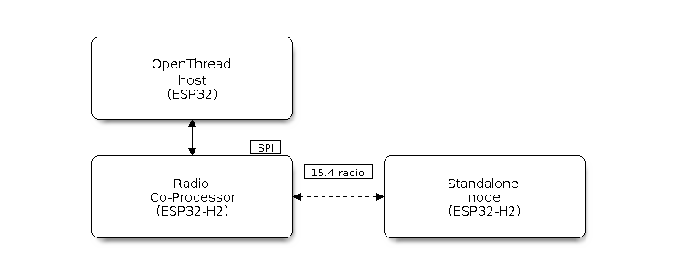 The chip is connected to another host running the OpenThread IP stack. It sends and receives 15.4 packets on behalf of the host. This mode is available on chips with 15.4 radio such as ESP32-H2 and ESP32-C6. The underlying transport between the chip and the host can be SPI or UART. For the sake of latency, we recommend using SPI as the underlying transport.
