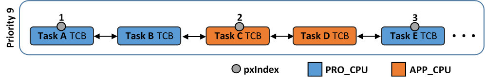 Round Robin Scheduling: The ESP-IDF FreeRTOS scheduler will skip tasks when implementing Round-Robin scheduling between multiple tasks in the Ready state that are of the same priority. To avoid this behavior, ensure that those tasks either enter a blocked state, or are distributed across a wider range of priorities.
