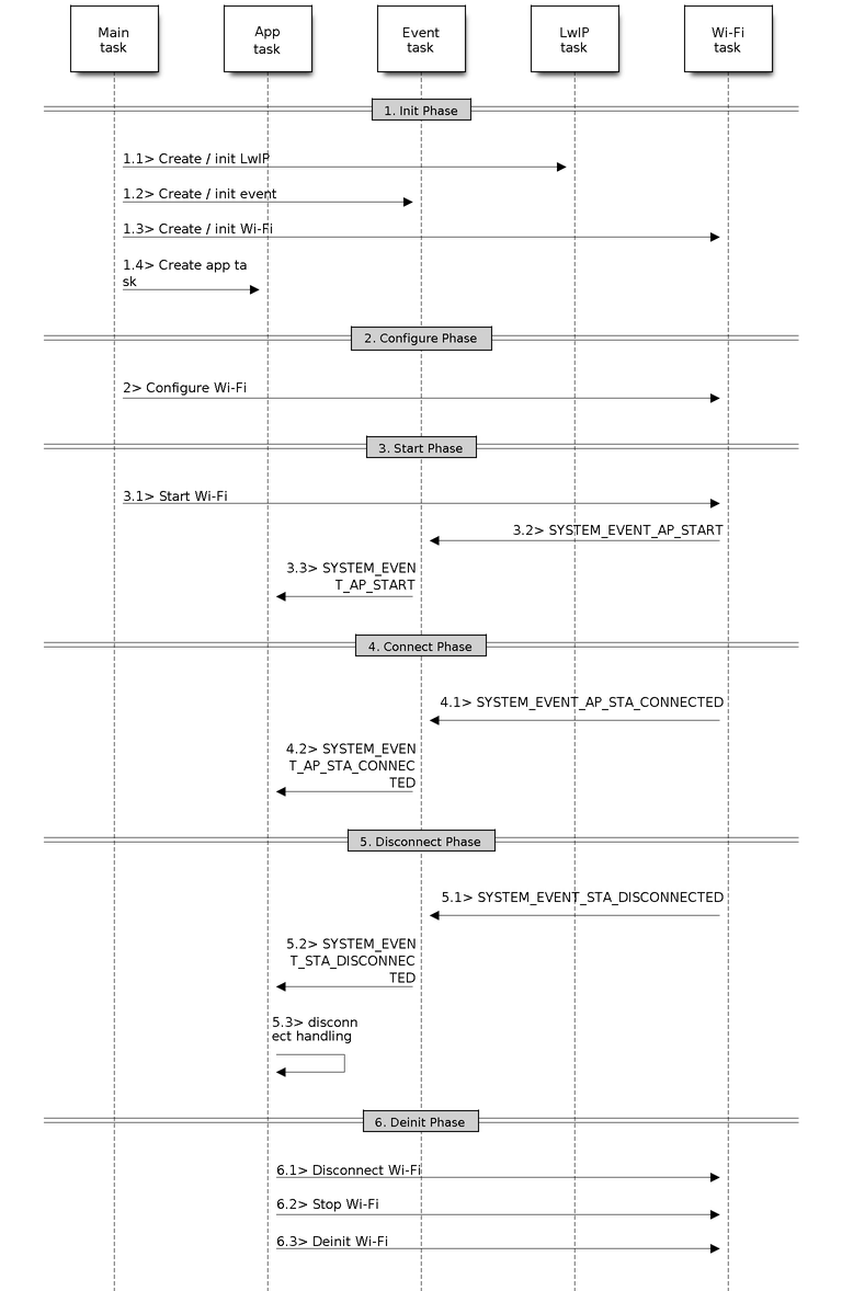 Generally, it is easy to write code in “sunny-day” scenarios, such as <SYSTEM_EVENT_STA_START>, <SYSTEM_EVENT_STA_CONNECTED> etc. The hard part is to write routines in “rainy-day” scenarios, such as <SYSTEM_EVENT_STA_DISCONNECTED> etc. Good handling of “rainy-day” scenarios is fundamental to robust Wi-Fi applications. Refer to <ESP32 Wi-Fi Event Description>, <ESP32 Wi-Fi Station General Scenario>, <ESP32 Wi-Fi AP General Scenario>