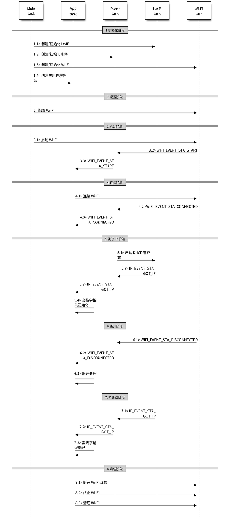 由于某些原因,Wi-Fi 连接被切断并引发了 WIFI_EVENT_STA_DISCONNECTED 事件。根据当前实现,此时所有 TCP 连接都将被移除,且保持活动的套接字将处于错误的状态中。但是,由于应用程序设计者认为网络层 不应 考虑这个 Wi-Fi 层的错误,因此应用程序不会关闭套接字。