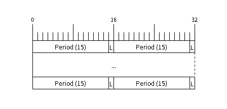 Before being able to transmit some RMT pulses, we need to define the pulse pattern. The minimum pattern recognized by the RMT controller, later called an ‘item’, is provided in a structure rmt_item32_t. Each item consists of two pairs of two values. The first value in a pair describes the signal duration in ticks and is 15 bits long, the second provides the signal level (high or low) and is contained in a single bit. A block of couple of items and the structure of an item is presented below.