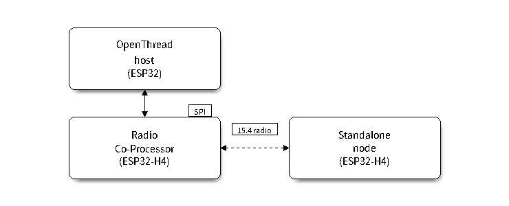 The chip will be connected to another host running the OpenThread IP stack. It will send and received 15.4 packets on behalf of the host. This mode is available on chips with 15.4 radio such as ESP32-H4. The underlying transport between the chip and the host can be SPI or UART. For sake of latency, we recommend to use SPI as the underlying transport.
