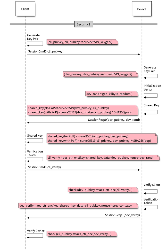 - Security1 - Curve25519-based key exchange, shared key derivation and AES256-CTR mode encryption of the data. It supports two modes :
