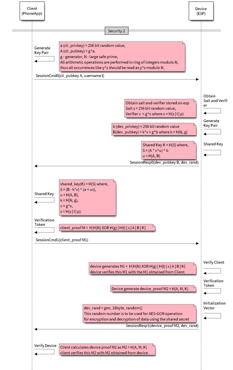 Security2 scheme is based on the Secure Remote Password (SRP6a) protocol - RFC 5054. The protocol requires the Salt and Verifier to be generated beforehand with help of the identifying username I and the plaintext password p. The Salt and Verifier are then stored on ESP32-S2. - The password p and username I are to be provided to the Phone App (Provisioning entity) by suitable means for example QR code sticker.
