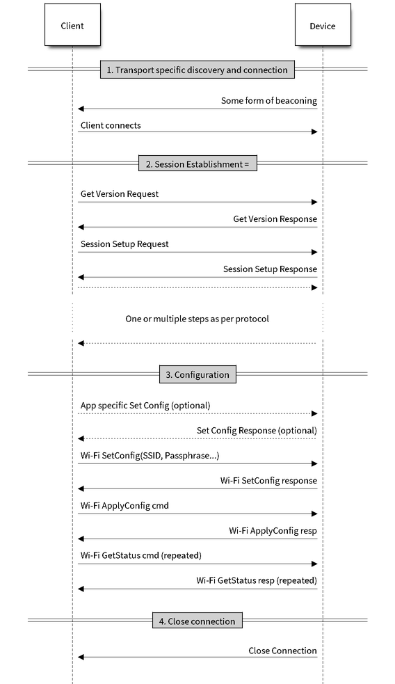 2. Transport Flexibility: The protocol can work on Wi-Fi (SoftAP + HTTP server) or on BLE as a transport protocol. The framework provides an ability to add support for any other transport easily as long as command-response behaviour can be supported on the transport.