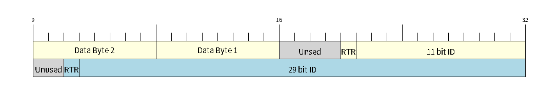 双过滤器模式 使用接收代码和掩码定义两个单独的过滤器,支持接收更多 ID,但不支持筛选扩展 ID 的全部 29 位。以下图示说明了在 双过滤器模式 下解析 32 位接收代码和掩码的方式。注意:黄色和蓝色字段分别表示标准和扩展帧格式。