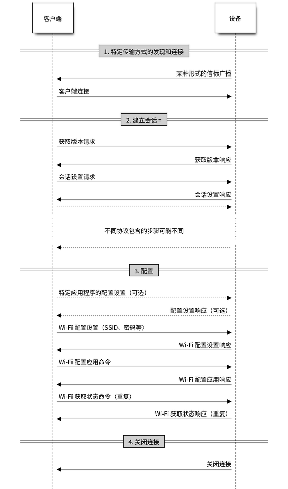 该协议可以作为 Wi-Fi(SoftAP + HTTP 服务器)或低功耗蓝牙上的传输方式,并且可轻松应用于任何支持请求—响应行为的传输方式。