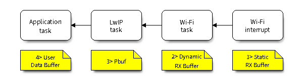 目前,LwIP 和 Wi-Fi 驱动程序中默认的缓冲区类型是“动态”,意味着 LwIP 和 Wi-Fi 都与应用程序共享内存。程序员应该时刻牢记这一点,否则将面临如“堆内存耗尽”等的内存问题。