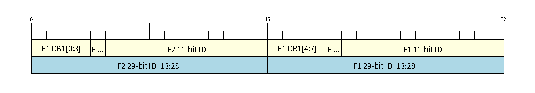 双过滤器模式 使用接收代码和掩码定义两个单独的过滤器,支持接收更多 ID,但不支持筛选扩展 ID 的全部 29 位。以下图示说明了在 双过滤器模式 下解析 32 位接收代码和掩码的方式。注意:黄色和蓝色字段分别表示标准和扩展帧格式。