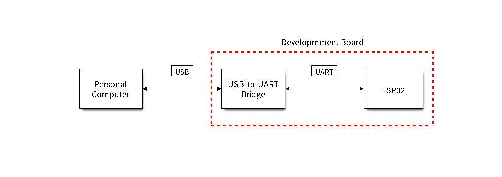 在安装有 USB 至 UART 桥的开发板中,PC 和桥之间通过 USB 连接,桥和 ESP32 之间通过 UART 连接。