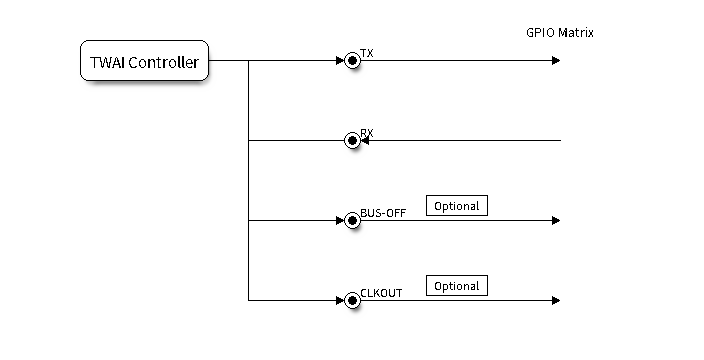 TWAI 控制器的接口由四条信号线组成,分别为 TX、RX、BUS-OFF 和 CLKOUT。这四条信号线可以通过 GPIO 矩阵连接到 ESP32-S2 的 GPIO 管脚上。