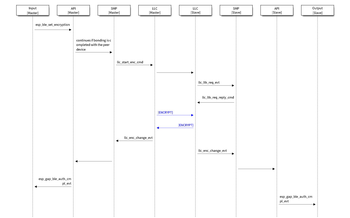 • 初始加密(未绑定): 当两个低功耗蓝牙设备之间未进行过绑定时,加密将在配对过程中进行。是否绑定取决于配对配置。