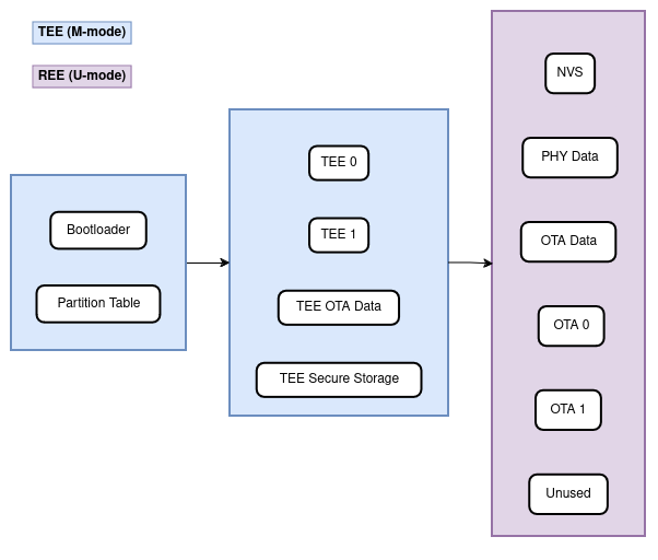 TEE OTA requires configuring the partition table of the device with at least two TEE OTA app slot partitions (i.e., tee_0 and tee_1) and a TEE OTA Data Partition (type data and subtype tee_ota).