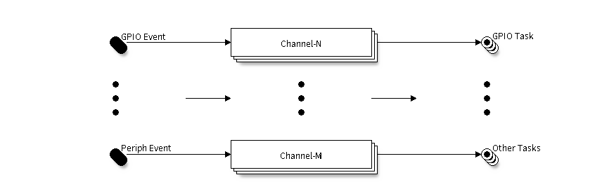 支持 ETM 功能的外设向 ETM 提供其事件和任务的连接关系。ETM 通道可以连接任意事件和任务,事件和任务甚至可以来自于同一个外设。然而,对于一个 ETM 通道,一次只能将一个事件与一个任务连接(即 1 对 1 关系)。如果要使用不同事件触发同一任务,则需申请多条 ETM 通道。