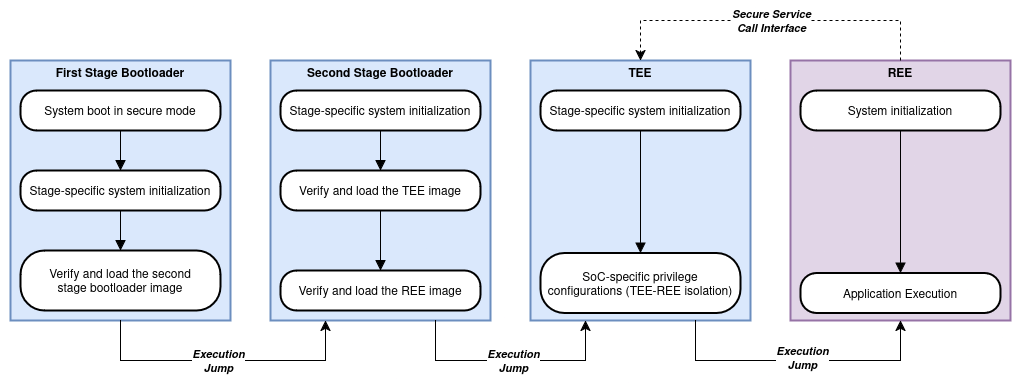 The TEE firmware is primarily loaded and executed from the internal secure SRAM. However, due to SRAM's limited capacity, some portions of the TEE firmware are stored and executed from a dedicated external flash partition, which is protected from access by the REE. This firmware is responsible for securely configuring the system, ensuring isolation and protection of both internal and external memory, as well as peripherals.