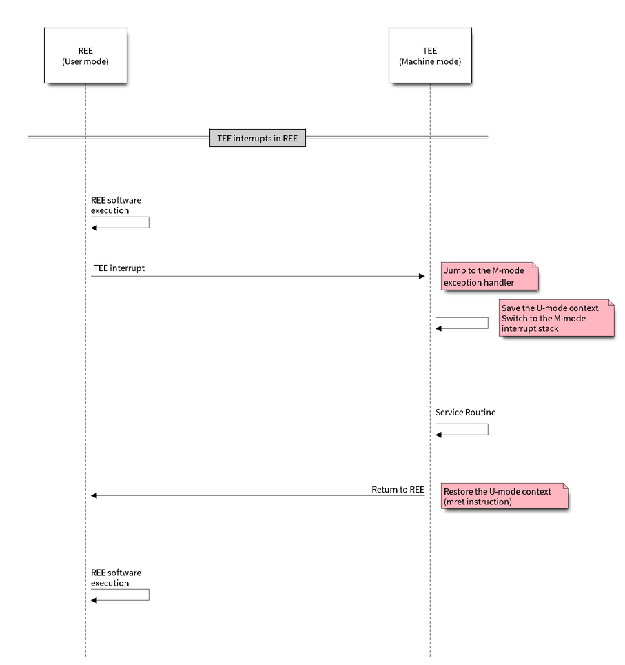 The TEE and REE each have their own vector tables, with one interrupt pin dedicated to secure interrupts. TEE interrupts are always given higher priority over REE interrupts. The TEE firmware provides APIs for registering secure, peripheral-specific interrupt handlers.